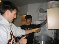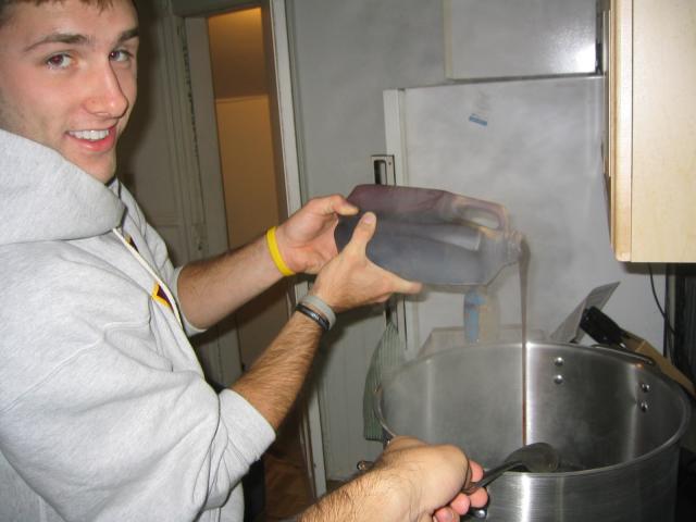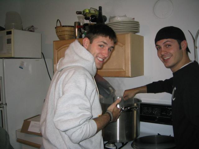 The First BatchThis is my (our, my roommate Adam and I) first attempt, obviously. We're doing a Nut Brown Ale as both of us peg Newcastle as our favorite beer. It's a "dark" beer, but its light enough that most people who don't like dark beer even enjoy it. The chocolatey tones of Newcastle are excellent, and hopefully we will get some of that action. Yes we look like tools in these pictures, we tried for that effect. When we run a brewery we'll be laughing at you, don't worry.