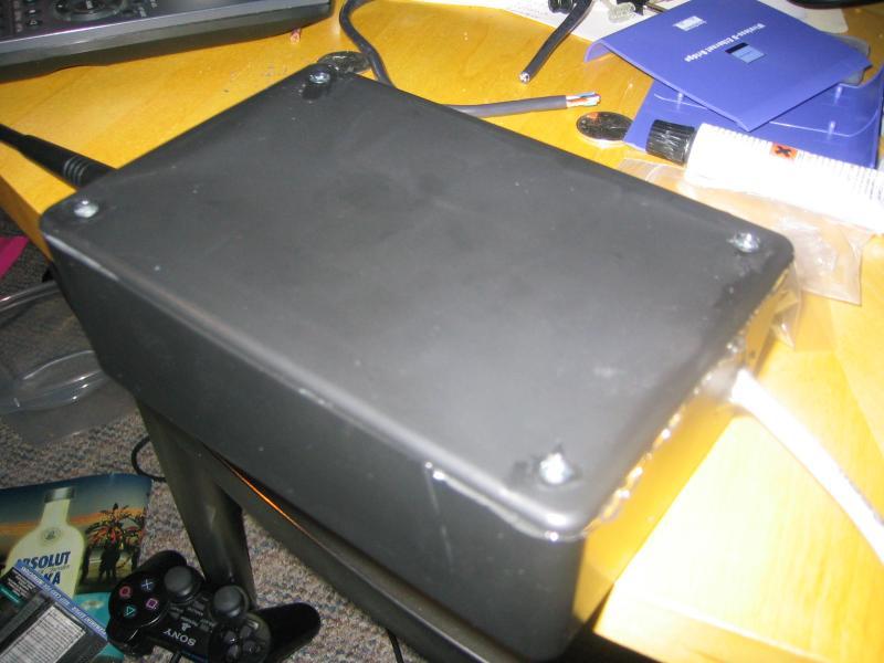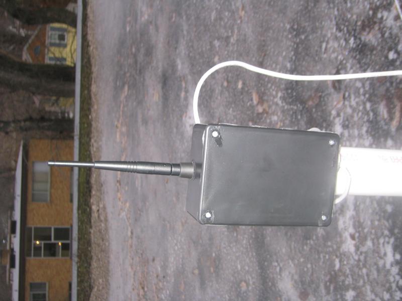 Next was waterproofing. I took the WET11 out of its case and removed the antenna pigtail. With some finesse, the WET11 board fit perfectly into a Radio Shack project enclosure. I drilled a hole in the top for the antenna (which could simply be unscrewed to replace it with any other antenna that fits that connector (TNC?)), and a hole in the bottom for cat5. A little JB Weld and Marine Goop later, and the enclosure is sealed against the elements.